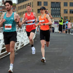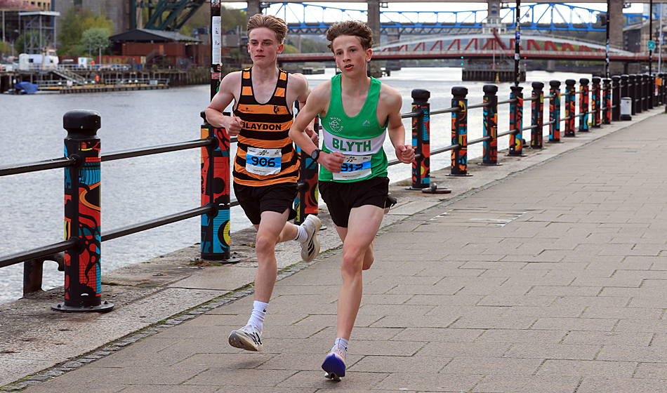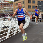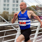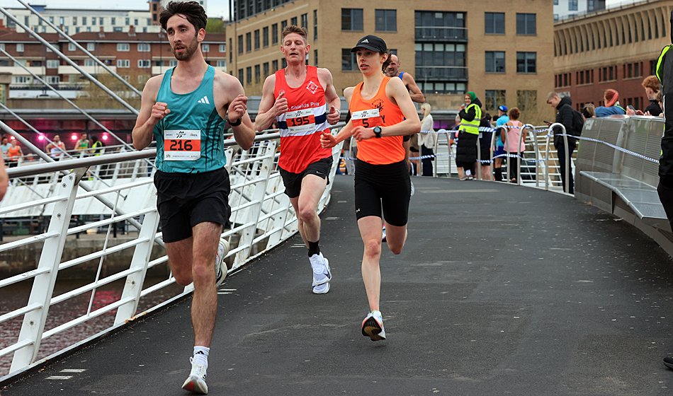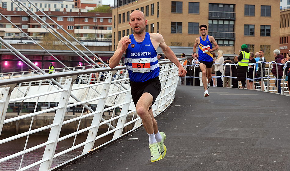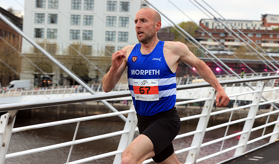 A resurgent, thirty nine year old Carl Avery from Morpeth won the Quayside 5K and NECAA Championship in fine style last night, April 22nd. A pre-race tip from Chris Parr that Avery was in fine form proved to be very true as he grabbed the race by the scruff of the neck from the gun, tracked closely by Leeds City’s Joe Firth, Houghton’s Alex Brown and Tyne Bridge’s Zak Kettle. The pressure from Avery was unrelenting and as the leaders entered the final kilometre at the Swing Bridge there was three in contention, Avery in the driving seat closely followed by Firth and Brown but the Morpeth man found another gear and ramped the pace up further to hit the Gateshead Millenium Bridge 10 metres clear and the finish in sight. He crossed the line in a brisk 14:28 with Firth two seconds back on 14:30. Alex Brown held on well for third in 14:36 and second in the North-East Championships after his clear win at Blyth over 10Km the week before. Zak Kettle was next to finish in 14:46 and bronze medallist in the NECAA Championships.